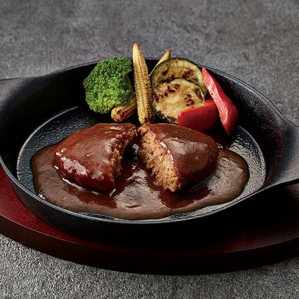 食感にこだわり、お肉を粗挽きに仕上げたふっくらハンバーグ。肉と香味野菜の旨みが溶け出したソースに隠し味の赤ワインのコクが加わり、一層お肉の旨みを引き立てます。
